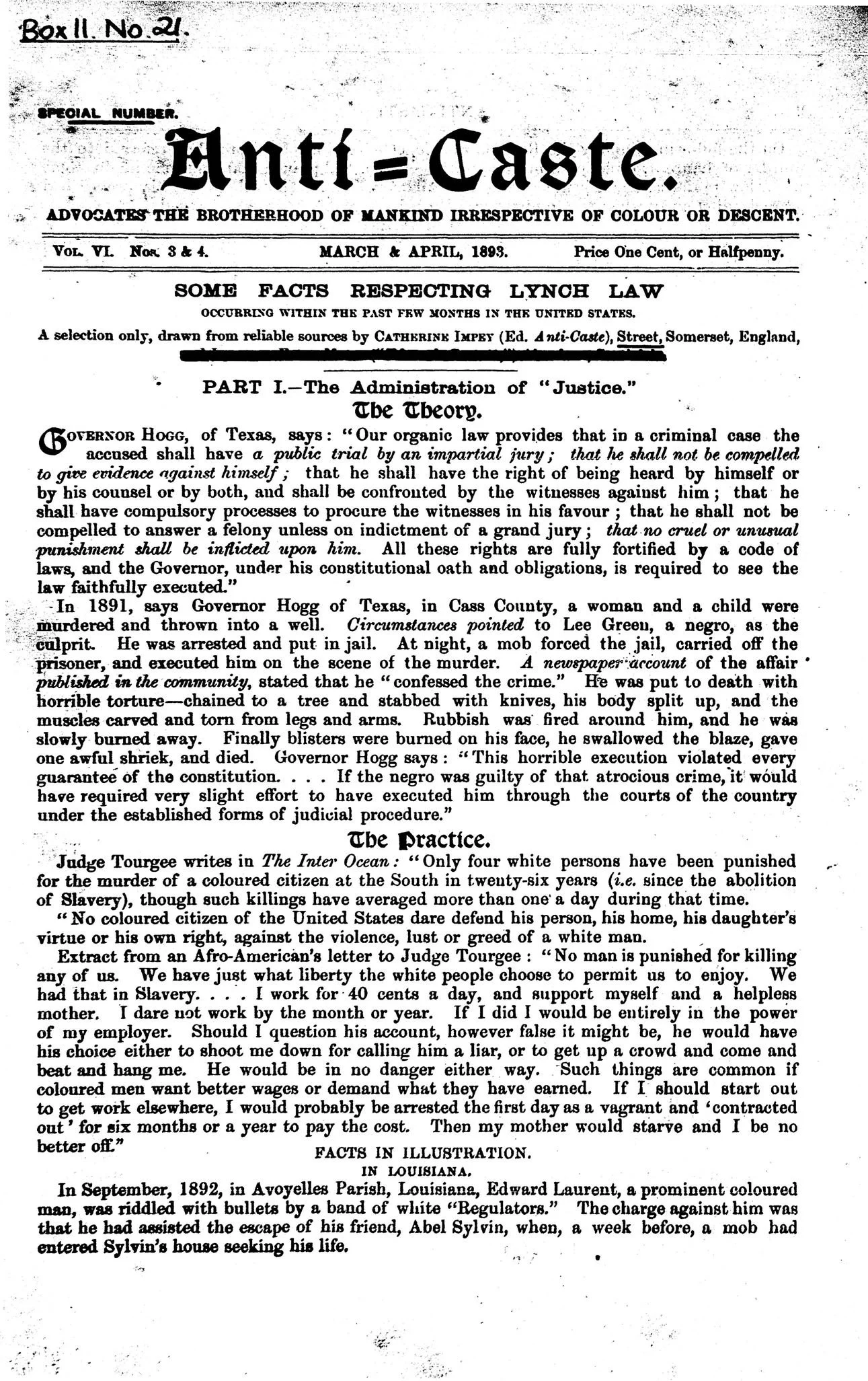 Catherine Impey edited the 1893-95 periodical Anti-Caste.