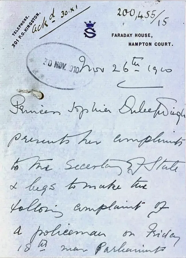 A letter of complaint from Princess Sophia to UK police, following incidents of police violence against suffragettes marching on Parliament in 1910.